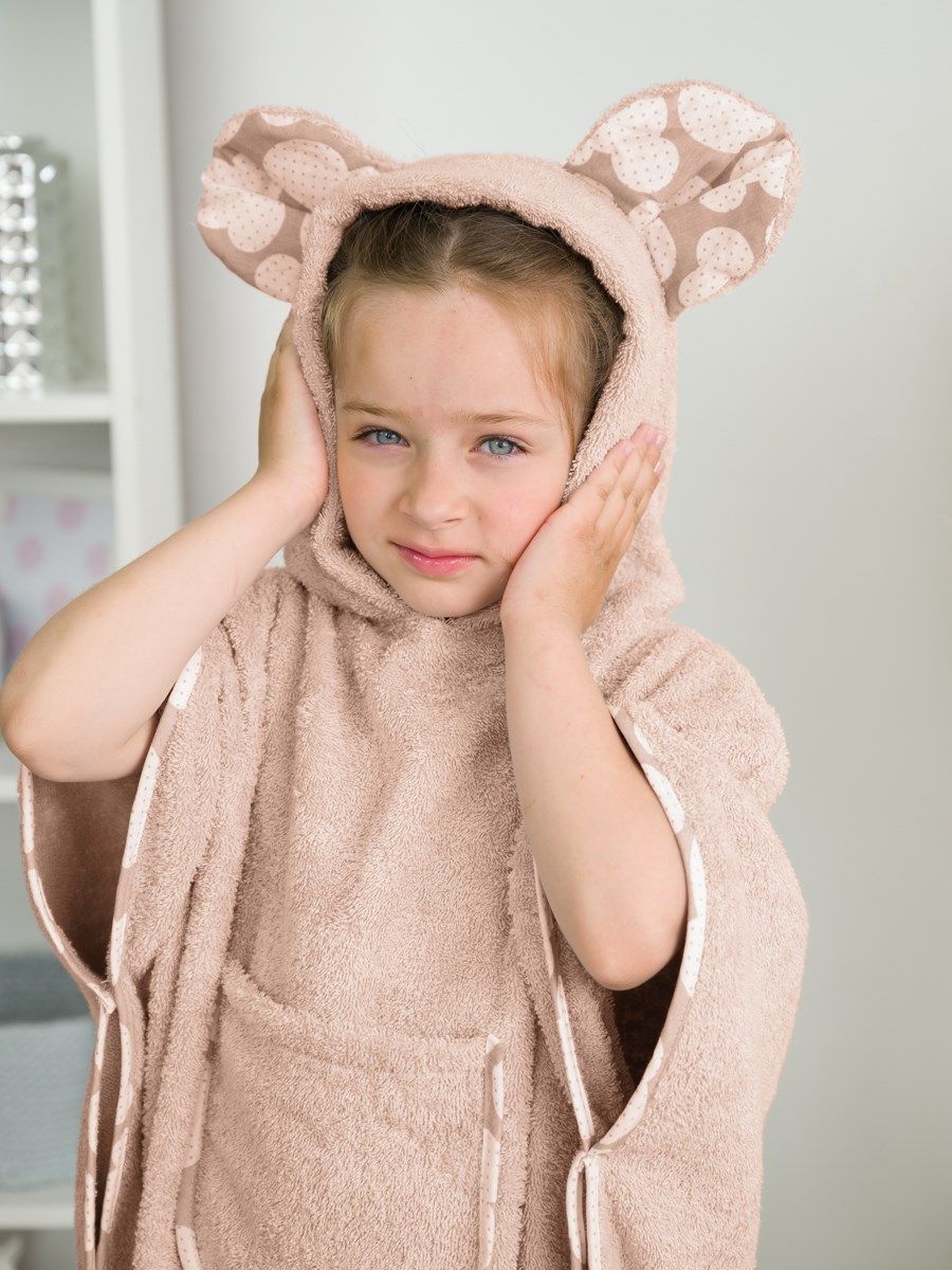 Пончо для детей станет интересной альтернативой банному полотенцу или домашнему халату после купания, для посещения сауны или бассейна. Капюшон с ушами мышки, вместительный фронтальный карман и контрастная бязевая отделка делают модель максимально удобной и ещё более стильной.