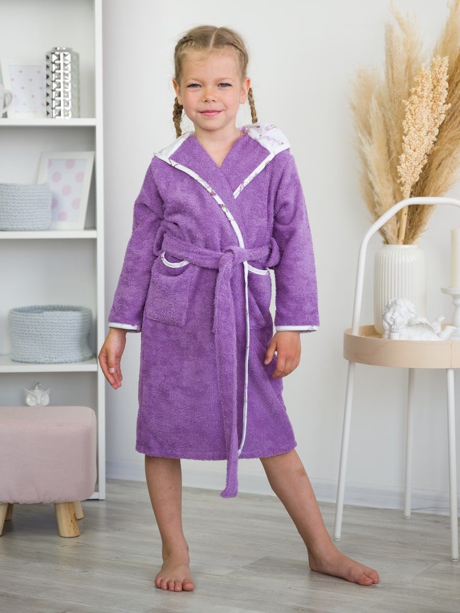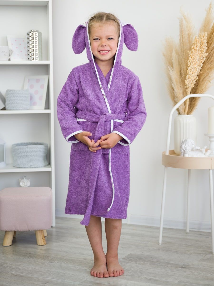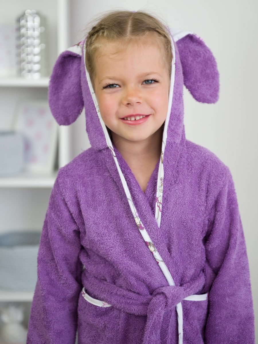 Халат для девочки с ушками зайца выглядит стильно и забавно. Контрастная окантовка из натуральной белой бязи делает махровый халат ещё более красивым, а вместительные карманы и широкий пояс обеспечивают повышенный комфорт.